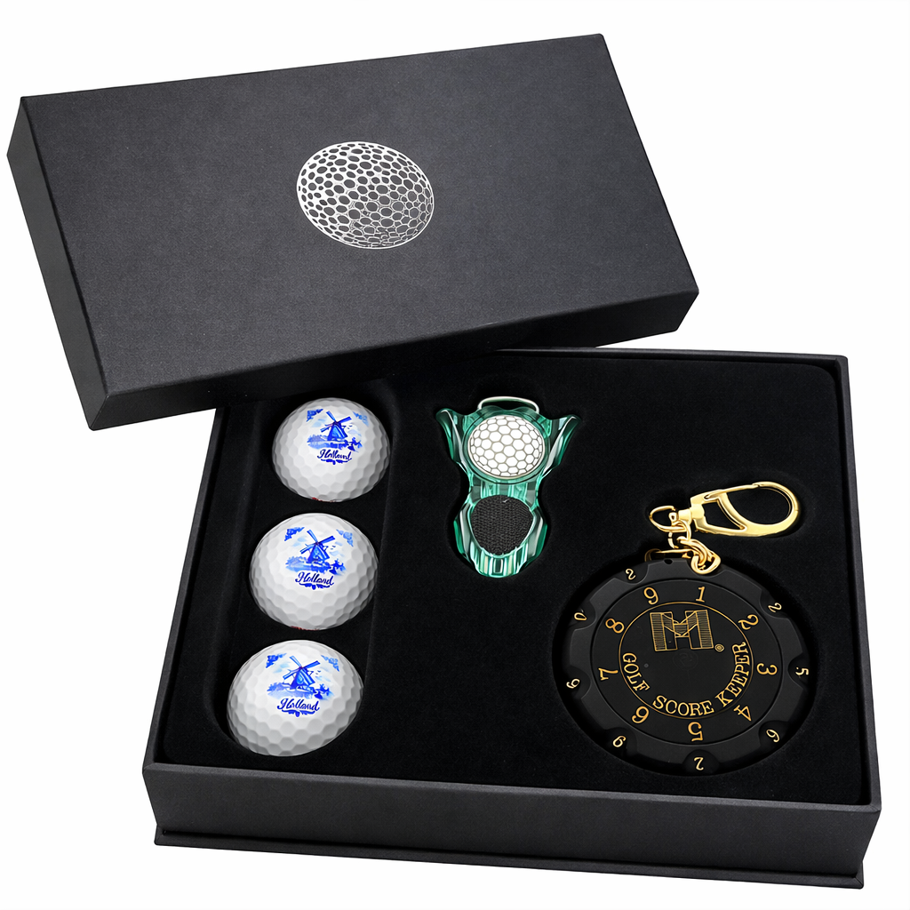De set wordt geleverd in een luxe zwarte geschenkbox en bevat alles wat een golfer nodig heeft: een praktische scoreteller voor 18 holes, drie hoogwaardige Delftsblauwe golfballen en een handige pitchfork met marker. De golfballen zijn niet alleen prachtig om te zien, maar ook volledig functioneel en geschikt voor gebruik op de golfbaan.
